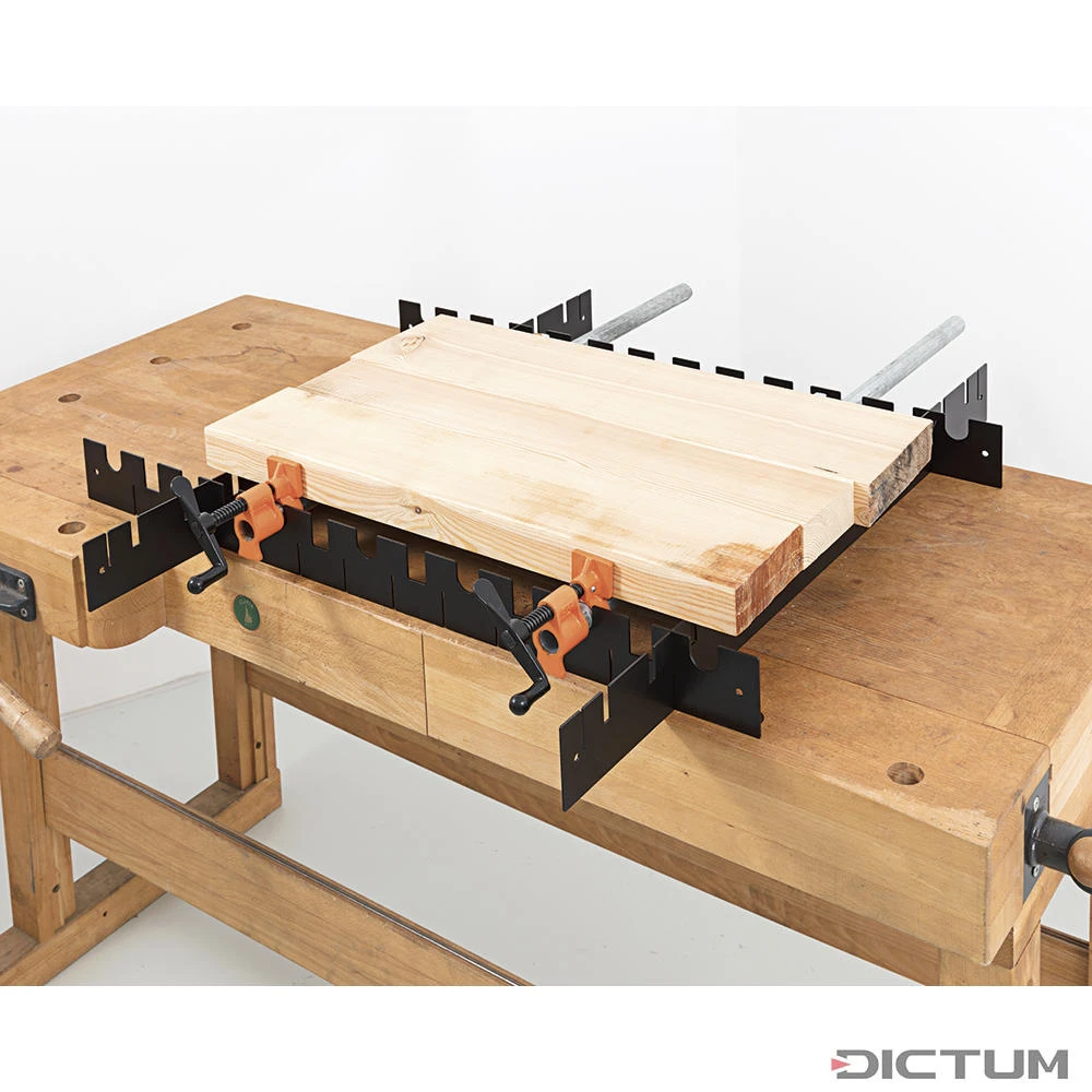 Cette aide à l’encollage en métal facilite et accélère, par exemple, le collage de plaques ou de marches d’escaliers. Grâce aux différents évidements, les serre-joints (par ex. N° 720421), les serre-joints à barre (par ex. N° 708926), les serre-joints en aluminium (par ex. N° 708907) ainsi que les jeux d’éléments de serrage pour tuyaux d’eau,(par ex. N° 708391) à diamètre extérieur ¾ pouces (27 mm) peuvent être utilisés pour coller sans que les serre-joints tombent.